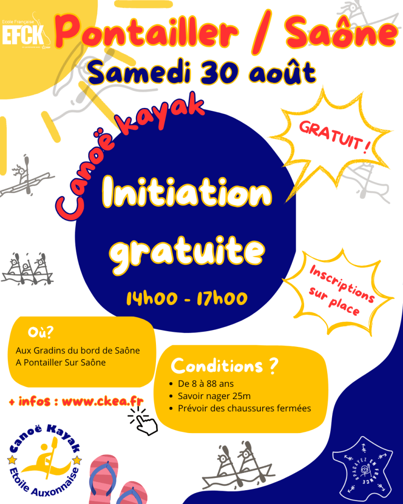 Nous vous accueillons à Pontailler sur Saône le Samedi 30 aout de 14h à 17h pour vous faire profiter d’une initiation ou d’une balade gratuite sur la vieille Saône.